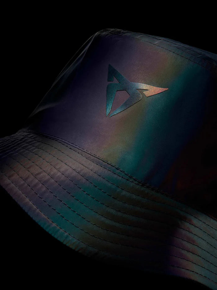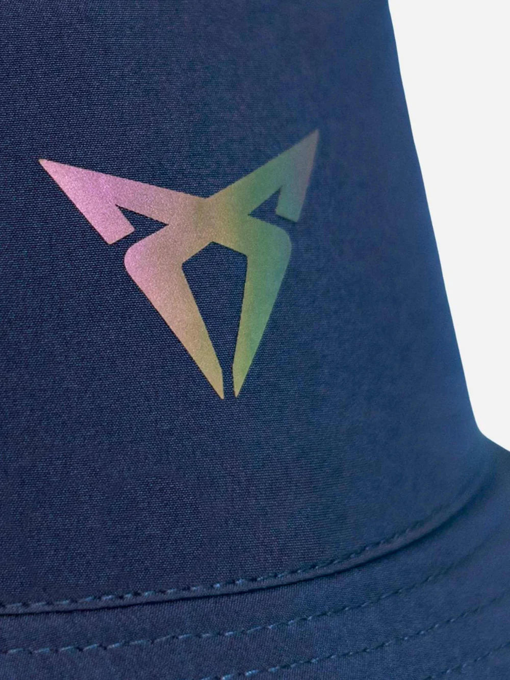 The CUPRA reversible bucket hat is made from recycled polyester. It offers two style options: the iridescent fabric on one side is perfectly balanced by the understated moonslate blue on the other.